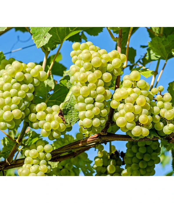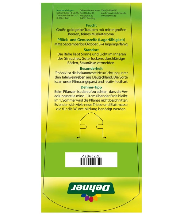 Der Wein ‚Phönix‘ ist eine der bekanntesten Neuzüchtungen unter den Tafelweinreben in Deutschland. Diese Sorte wurde so gezüchtet, dass sie ideal mit unserem Klima zurechtkommt. Der Wein ‚Phönix‘ trägt große, goldgelbe Trauben und besitzt ein feines Muskataroma. Die Früchte können von September bis Oktober geerntet werden. Die Gartenpflanze hat einen starken Wuchs und besitzt eine gute Frosthärte und eine hohe Toleranz gegenüber Pilzkrankheiten. Sie können die Trauben frisch servieren oder sie zu Wein oder Saft verarbeiten.