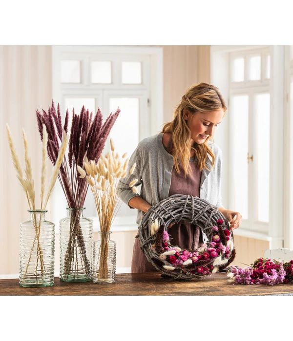 Wenn Sie auch selbst gerne Sträuße binden, wird Ihnen das mit verschiedenen Trockenblumen bestimmt große Freude bereiten. Dabei eignen sich die großen Pampasgras Wedel perfekt, um die entscheidenden Akzente in Ihrem Gebinde zu setzen, indem Sie sie bewusst als Highlights über das Bouquet herausragen lassen und erst dann unten einkürzen, wenn Sie mit der Wirkung zufrieden sind. Ob für Sie selbst oder für einen lieben Menschen – dieser Strauß wird lange als attraktiver Blickfang dienen.