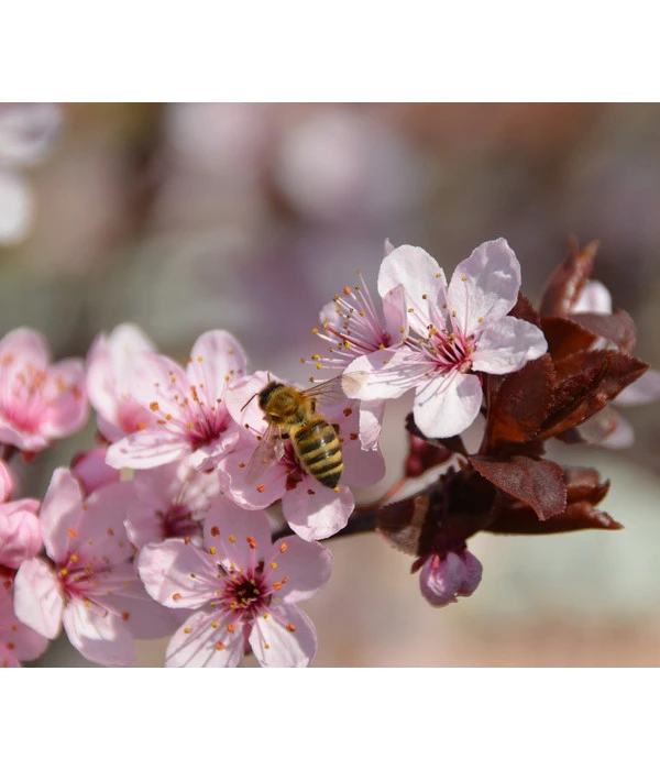 Das dunkelrote Laub, mit dem sich die Zwerg-Blut-Pflaume jedes Jahr im Frühling schmückt, bildet einen wunderschönen Kontrast zu den zarten, weiß-rosa Blüten, die im April und Mai erscheinen und in der Frühlingssonne strahlen. Doch damit ist noch nicht genug der Überraschungen, die die Zwerg-Blut-Pflaume für Sie bereithält. Haben sich die Blütenblätter Ende Mai wie ein Teppich aus Schneeflocken unter das Bäumchen gelegt, so beginnt es, zunächst kaum sichtbar, mit der Produktion leckerer kleiner Pfläumchen. Denn das ist das Besondere an der Zwerg-Blut-Pflaume: Sie ist so dekorativ wie ein Zierstrauch und doch insgeheim ein echtes Obstbäumchen. Denn die kleinen Früchte sind überraschend lecker und können roh verzehrt oder auch weiter verarbeitet werden.