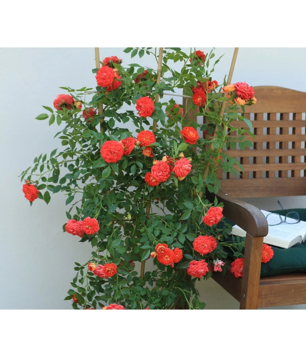 Feuriges Rot kämpft mit strahlendem Orange um die Vorherrschaft – die Blüten dieser Rose sind eine Sensation und an Leuchtkraft nicht zu überbieten! Vor allem weil sich dieses Spektakel vor dem Hintergrund des kräftigen, dunkelgrünen Laubs ereignet. Kein Wunder, dass Ihre Augen sofort zu der Zwerg-Kletterrose ‚Starlet® Carmen®‘ wandern werden, sobald Sie Ihren Garten betreten haben. Oder auf Ihrer Terrasse oder dem Balkon Platz genommen haben, denn diese Rose versprüht ihren Feuerzauber gerne auch auf kleinem Raum. Die Zwerg-Kletterrose ‚Starlet® Carmen®‘ gehört zur neuen Generation von Mini-Climbern, die nicht höher als 150-200 cm wachsen und auch in einem größeren Kübel prächtig gedeihen. Damit können sich auch Balkon- und Terrassengärtner den Traum von prächtigen Kletterrosen neben dem Sitzplatz erfüllen. Nehmen Sie gleich die Gelegenheit wahr und lassen Sie die Zwerg-Kletterrose ‚Starlet® Carmen®‘ Ihren Outdoor-Sitzplatz in eine romantische Rosenlaube verwandelt!